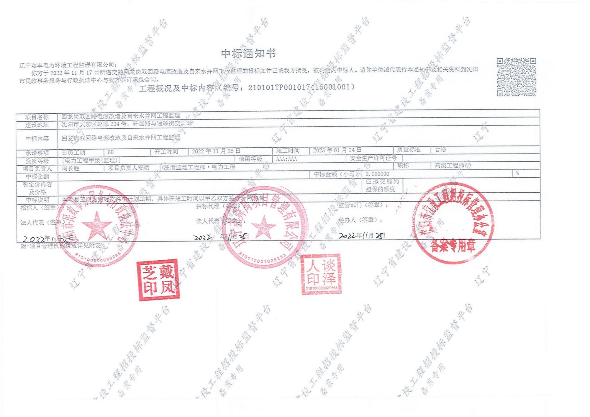 遼寧瑞豐電力環境工程監理有限公司于2022年10月20日與鞍山國電電力新能源有限公司簽訂了《國電電力遼寧岫巖整縣光伏發電一期農光、漁光互補項目》監理合同。